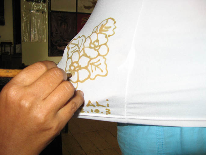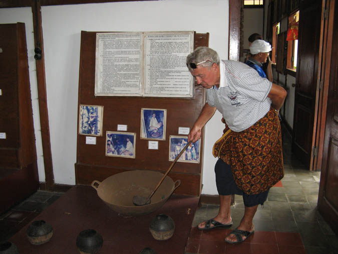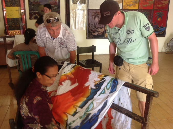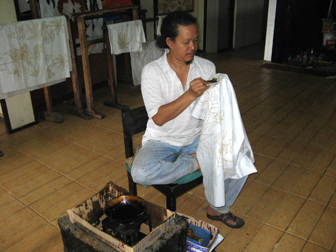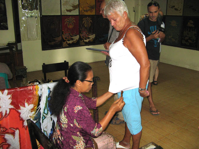 Onze eerste stop is bij een batikwinkeltje. Ik heb dit tijdens deze reis al diverse malen gezien en mijn nieuwsgierigheid is er wel van af. We weten hoe de motieven op de kleden worden gezet. Joke laat nog een print op haar shirt zetten, waarna we uiteraard weer naar een winkel worden geleid. Ik loop een rondje en zoek de bus weer op. Om 9.45 uur vertrekken we weer.