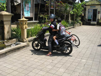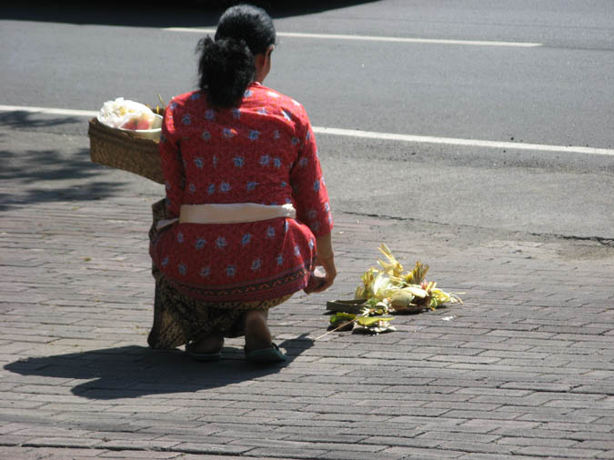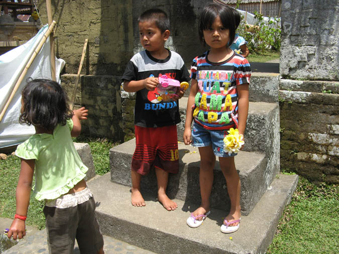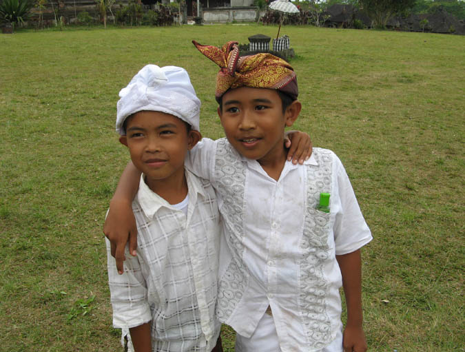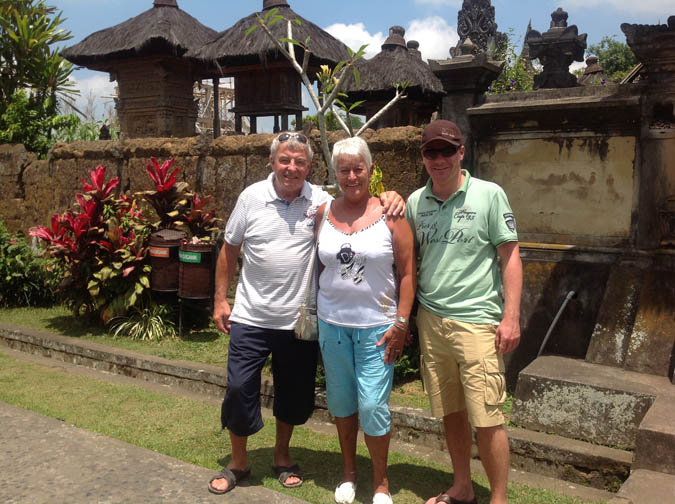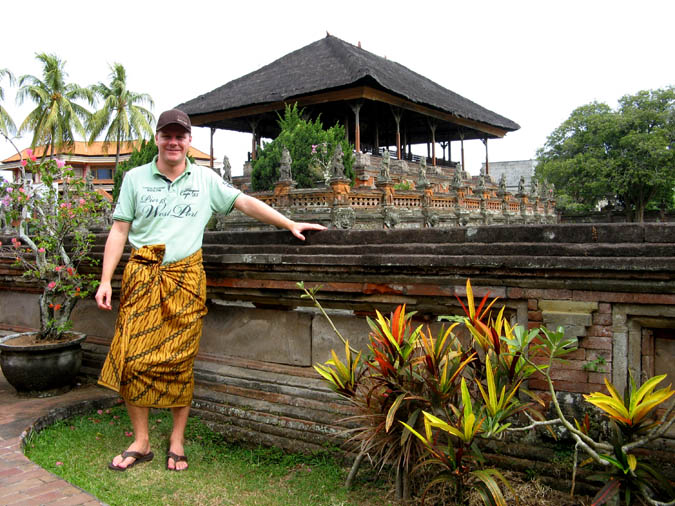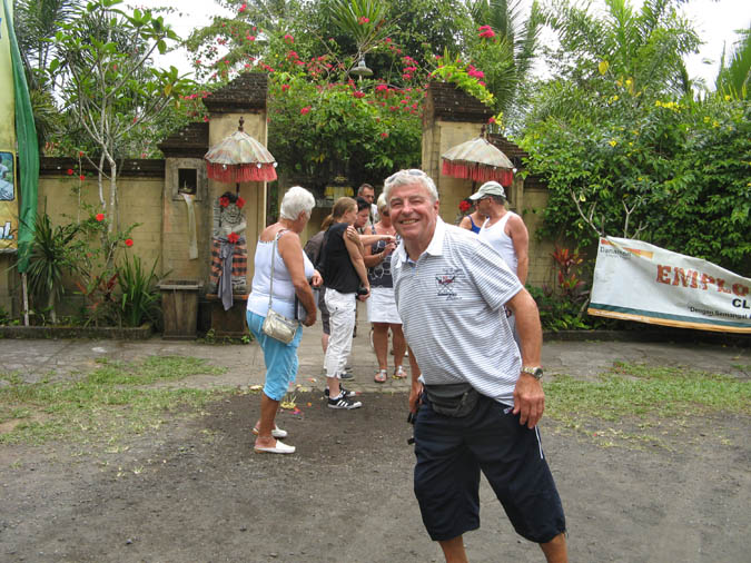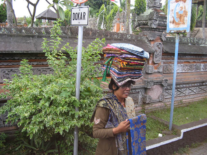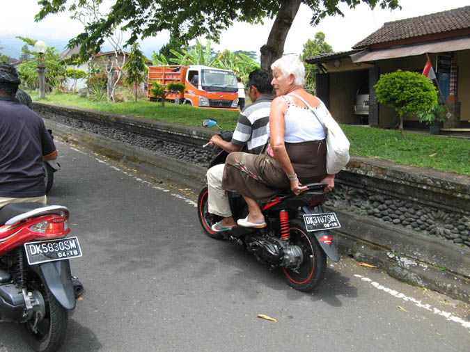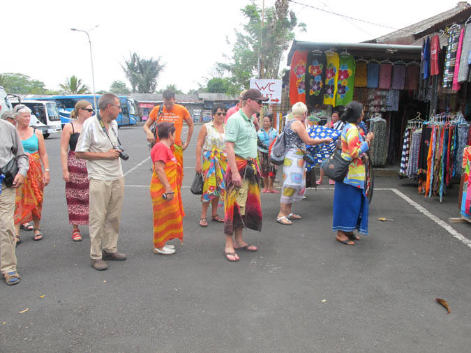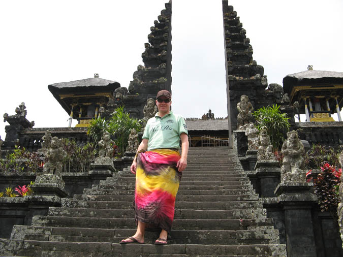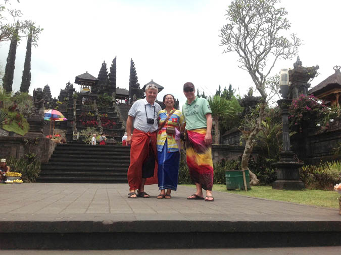 Na zo'n 3 kwartier rijden arriveren we in Pura, waar we de Moedertempel Besakih gaan bezichtigen. Het is verplicht om een sarong te dragen zodat we bedekt genoeg gekleed gaan. We 'huren' deze sarong bij een van de vele winkeltjes. Voordat we bij de tempel aankomen moeten we eerst een stuk bergopwaarts lopen. Je kan je ook met een scooter naar boven laten brengen. Joke maakt hier gebruik van. Jan en ik gaan lopend naar boven toe.