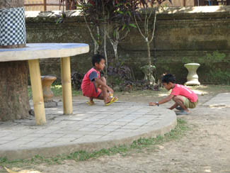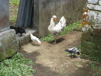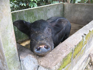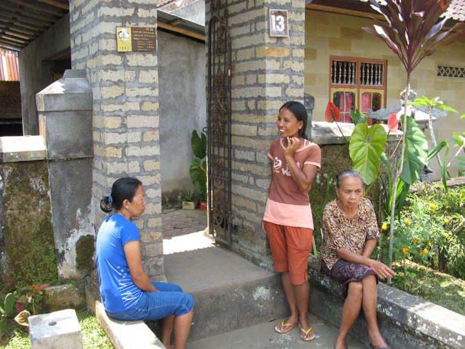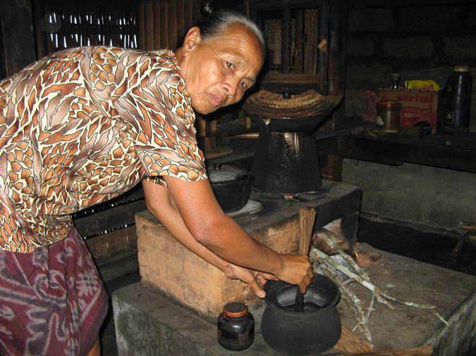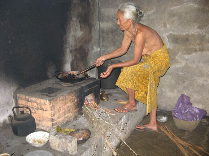 De bewoners van huisje nummer 13 staan al op ons te wachten. Het is zo dat gehele families in Indonesië bij elkaar worden. Moeder, vader, zonen, schoondochters, alles woont bij elkaar. We mogen elk vertrek bekijken. De ene oma ( met ontbloot bovenlichaam ) is in de keuken aan het bakken. Ook de andere oma is bezig met het eten. Alles wordt op een houtvuur klaargemaakt. Een gasfornuis of magnetron hebben ze er niet. Wanneer Jan en ik verder naar achteren lopen komen we een varken tegen. Het beest stinkt verschrikkelijk en knort volop.