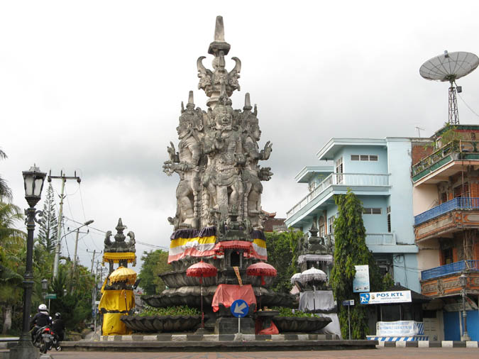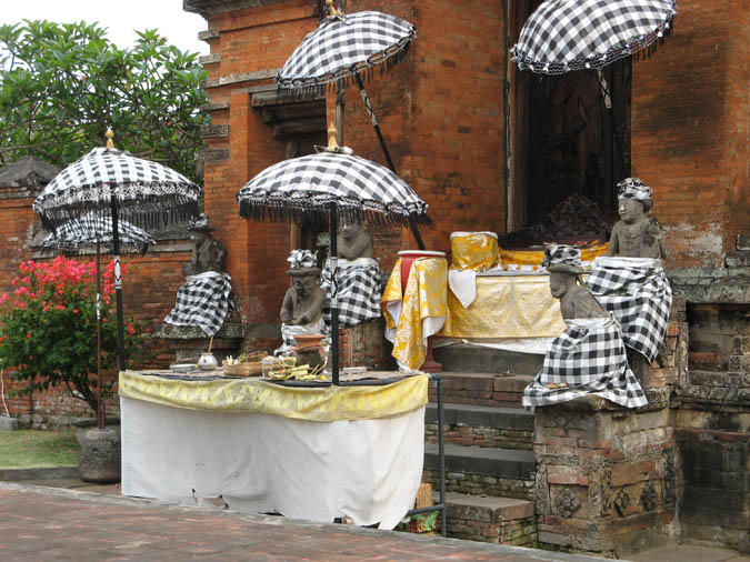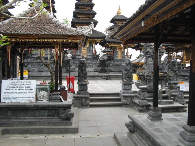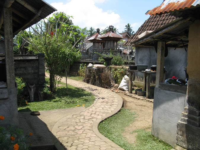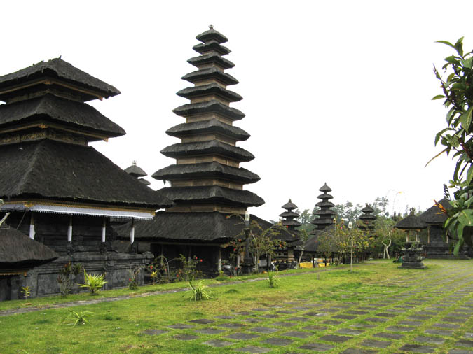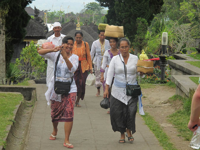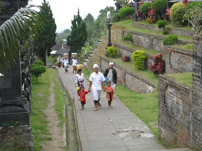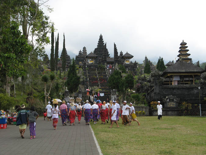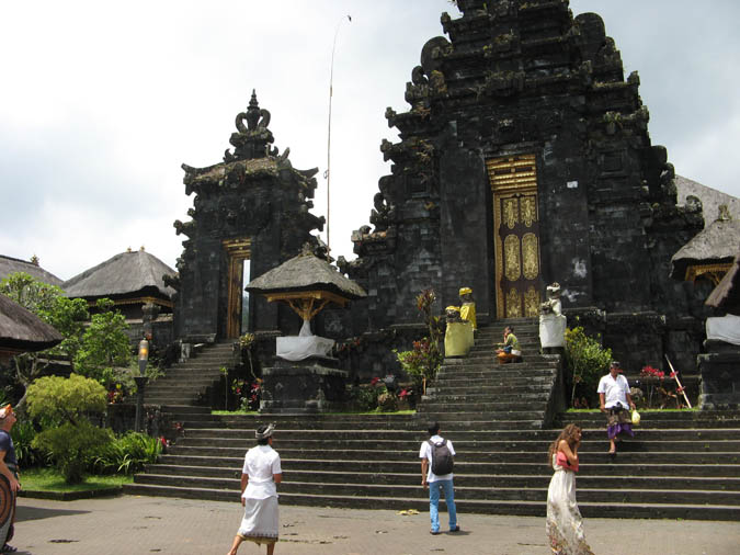 Na een kwartier wandelen kom ik aan bij de tempel Pura Besakih. Het is de grootste tempel van midden Bali. Deze hindoeïstische tempel ligt op de hellingen van de vulkaan Gunung Agung en dateert uit de 14e eeuw. De tempel bestaat uit circa 200 bouwwerken verdeeld over 30 complexen. Die zijn weer verdeeld over verschillende terrassen met meerdere Meru's en paviljoens. In de vierde maanmaand van de Balinese kalender ( maart/april ) vindt het belangrijkste feest plaats. Uit alle delen van het eiland komen ze dan naar deze tempel voor offers.