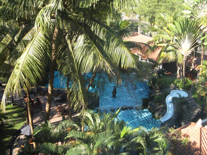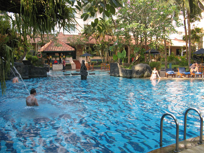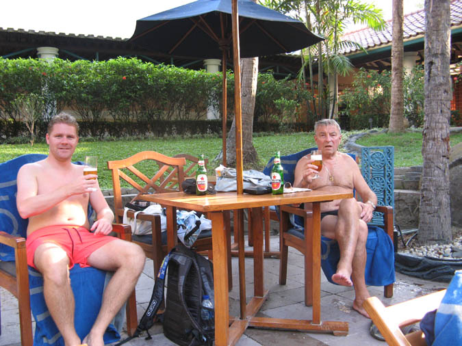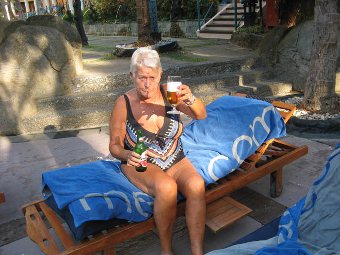 In het hotel aangekomen kleden we ons om en gaan naar het zwembad. Onder het genot van een koud biertje kunnen we lekker relaxen. Even later komen ook anderen van onze groep naar het zwembad toe. Els wil voordat ze het zwembad in gaat zich eerst even nat maken bij de pooldouche. Wanneer ze er onder gaat staan en de kraan open draait, blijkt ze een modder douche te krijgen. Het water is zwart. Ze zit helemaal onder. Ze is dit later gaan melden bij de receptie en het blijkt dat er werkzaamheden zijn geweest waardoor de leiding niet is doorgespoeld. Zo tegen 17.00 uur gaan Jan, Joke en ik naar onze kamers toe om ons op te frissen.