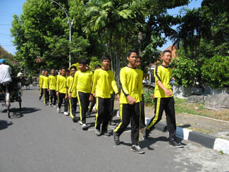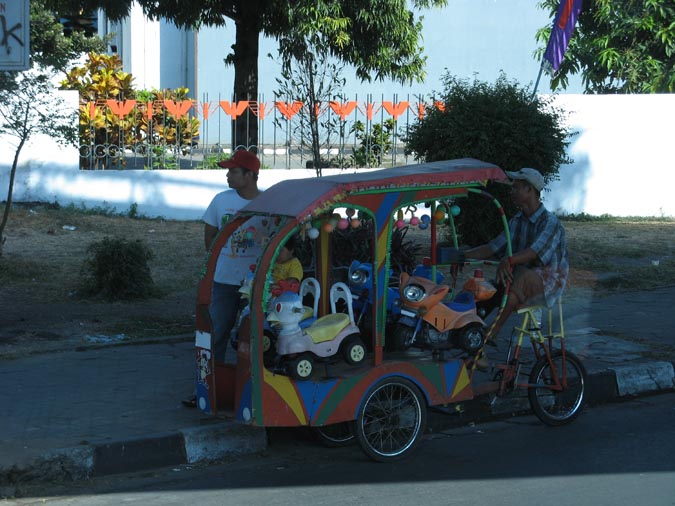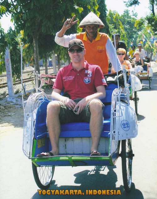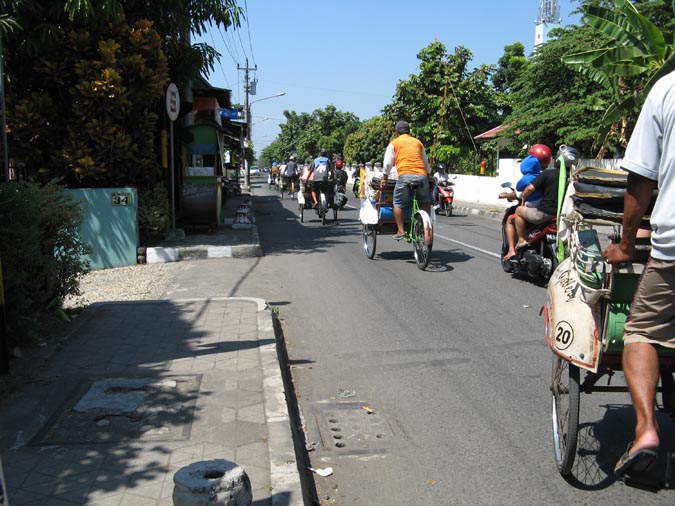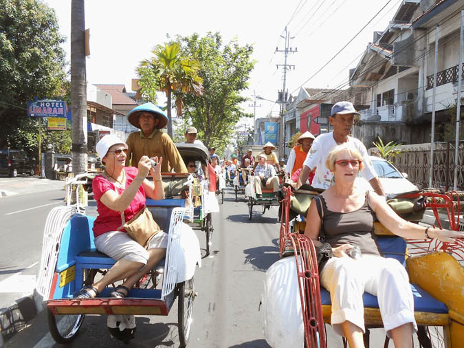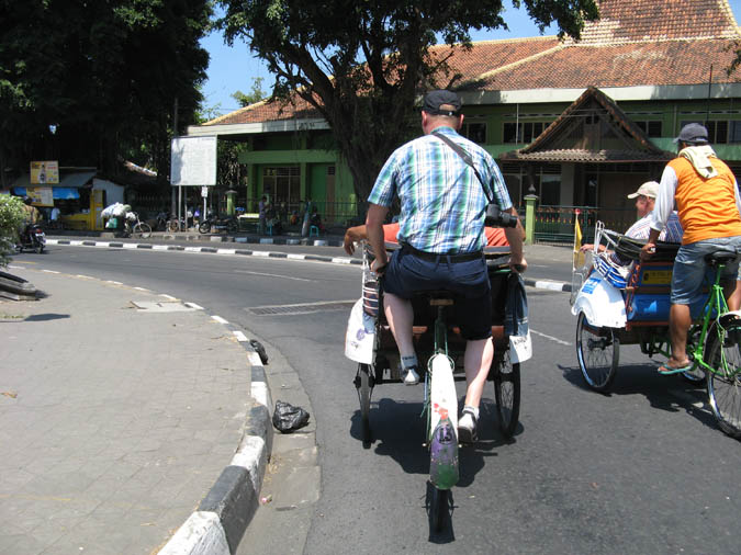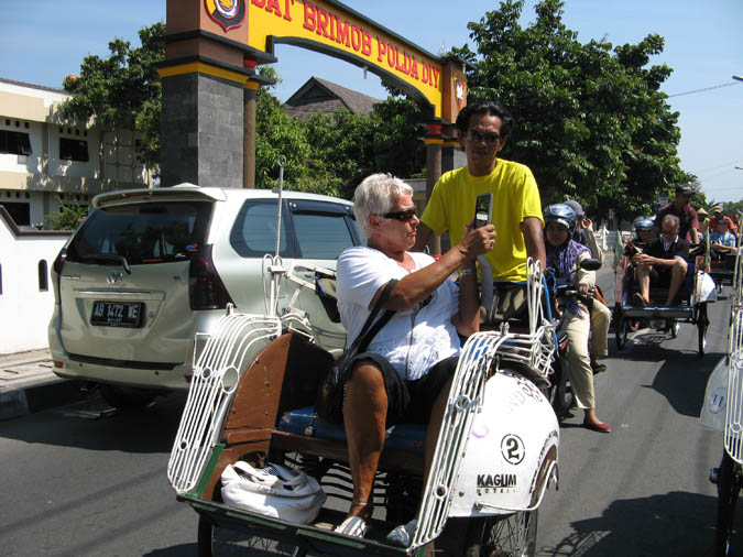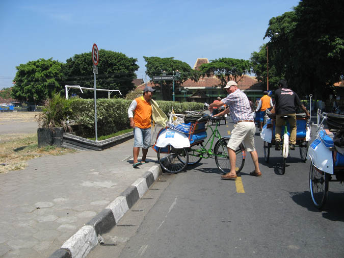 Naast de Batikshop staan becaks ( traditioneel Indonesisch vervoersmiddel ) klaar om ons naar het paleis van de Sultan te vervoeren. We nemen ieder plaats in een becak. Om 9.15 uur gaan we vertrekken. Het drukke verkeer wordt tegengehouden waarna we allemaal de weg op worden gereden.