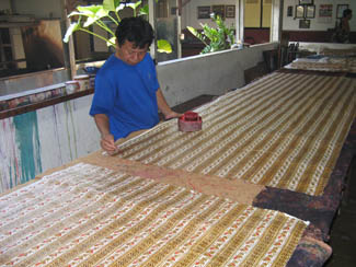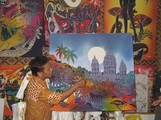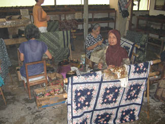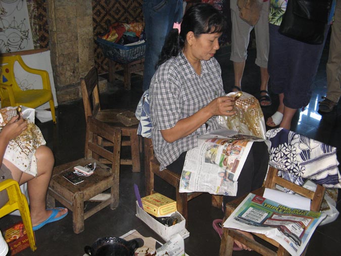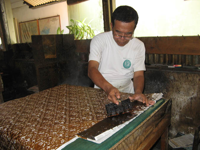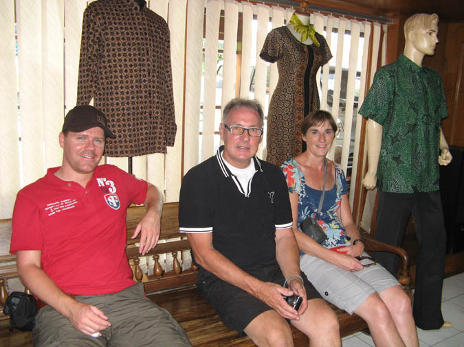 Na een klein stukje rijden komen we aan bij (weer) een Batikshop, nu voor kleding. Ook hier krijgen we een rondleiding. Batikken is een manier om lappen textiel met verf van een decoratie te voorzien, waarna deze lappen als kleding kunnen dienen. Batik kan echter ook een kunstvorm zijn voor wandkleden en schilderijen ( dat hebben we vanmorgen gezien ). Batikken is een heel oude kunstvorm. Er zijn doeken gevonden in het Midden-Oosten, in India en Centraal-Azië van meer dan 2000 jaar geleden.