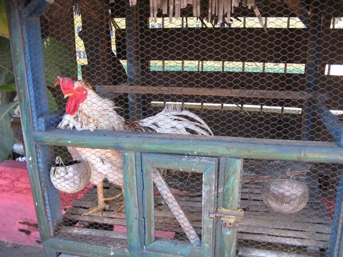 Er staan daar twee te kleine kooien met gevechtshanen erin. Het zijn forse hanen. Wanneer je iets te dichtbij komt laten ze al merken dat ze er niet van gediend zijn. Ik klets nog wat met Hans Stolte totdat de groep compleet is en klaar voor onze volgende bestemming.