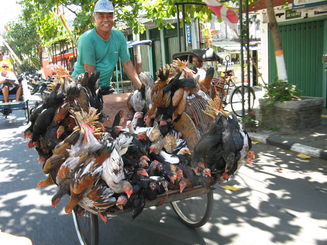 Onderweg komen we van alles tegen. We krijgen een mooie indruk van het straatbeeld. We rijden langs warungs, zien schoolkinderen die aan het sporten zijn ( ondanks de hitte van 30+ graden ), we zien kleine marktjes en standjes. We komen ook een becak tegen die geen persoon vervoerd, maar allemaal kippen. De beesten hangen op hun kop en zijn meer dood dan levend. Een aantal heeft al het loodje gelegd. We passeren ook een druk kruispunt. Je houdt je hart vast, maar alles verloopt vlekkeloos en kriskras door elkaar heen.