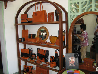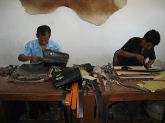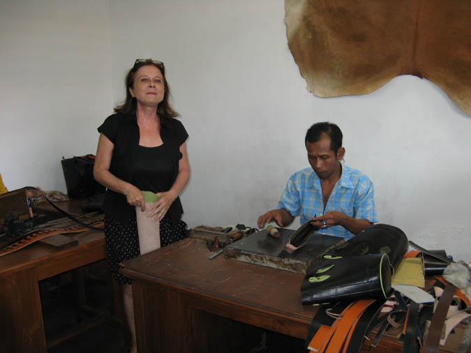 Onze volgende stop is bij een lederwinkeltje met de naam Jaya Langgeng dat wordt gerund door de Nederlandse Joan Linthorst die met een Indonesiër is getrouwd. We krijgen eerst een introductie wat ze vooral doet en hoe dat ze te werk gaat. Ze heeft diverse werknemers in dienst die ongeveer dezelfde COA hebben zoals die in Nederland wordt gehanteerd. Al haar producten ( tassen, riemen, portemonnee, etc ) worden handgemaakt. Na haar uitleg kunnen we het winkeltje bekijken. We krijgen er koffie en speculaaskoekjes. Enkelen van onze groep kopen wat. Zo tegen 12.10 uur gaan we weer op pad.