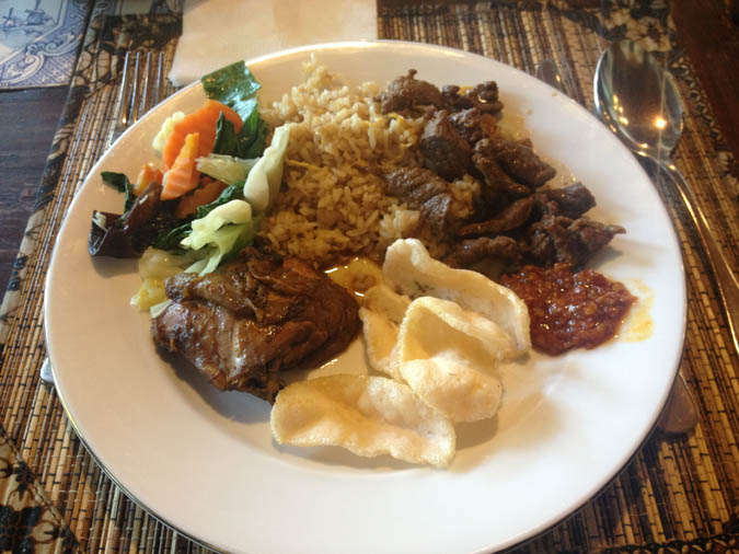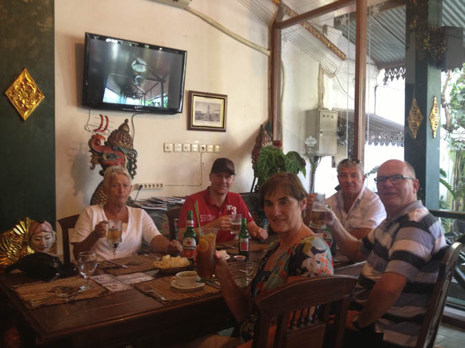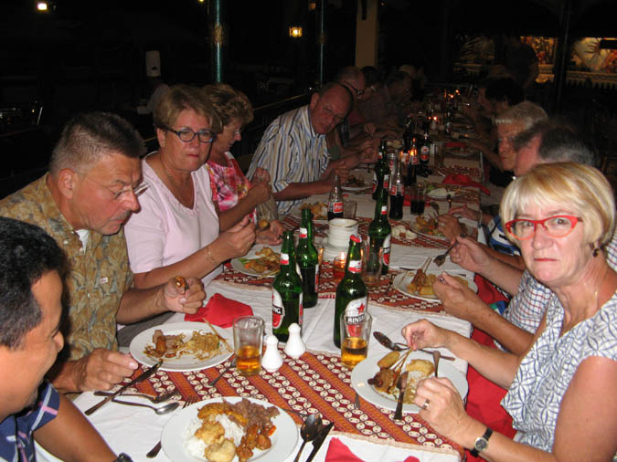 Om 13.15 uur gaan we lunchen bij restaurant Sekar Kedhaton. Aan onze tafel krijgen we gezelschap van Hans en Jolanda. Het eten smaakt prima. Bij het nagerecht zien we een soort van vrucht liggen waarvan we niet precies weten wat het is. Het blijkt 'snake fruit' te zijn. Het smaakt ongeveer naar walnoten. Hans spaart bierglazen en hij probeert een bierglas van Bintang te kopen. De serveerster geeft aan dat ze niet te koop zijn omdat het een limited edition is. Ook wanneer ze nog een keer gaat navragen bij haar chef is het antwoord negatief. Hans probeert het via reisleider Soe en dan lukt het wel. Hij krijgt het bierglas gratis mee mooi verpakt in een zakje. Om 14.30 uur zijn we klaar.
