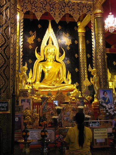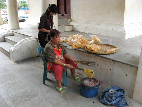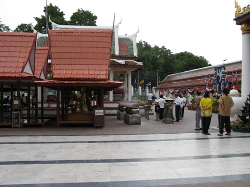Weer een dag waar we vroeg op moeten. Piep-Piep klonk het om 05.15 uur. Na ons te hebben opgefrist en aangekleed, gaan we vroeg naar de ontbijtzaal. De koffers zetten we alvast aan de deur, want die worden opgehaald terwijl wij aan het ontbijten zijn. Om 07.00 uur is iedereen klaar voor vertrek en gaan we op weg naar onze eerste stop. Dit is na zo'n 20 minuten bij een tempelcomplex. We nemen in de tempel een kijkje waarna we even over het marktje lopen. Om 8.00 uur als we willen vertrekken klink ineens het Thaise volkslied. Iedereen blijft staan waar hij stond en uit respect wachten wij ook even.