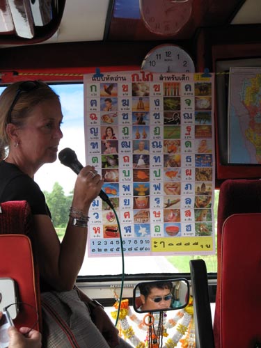 In de bus krijgen we van reisleidster Marjo een uitleg hoe het Thaise alfabet in elkaar steekt. Voor ons zijn het allemaal tekens waarvan we geen benul hebben wat die betekenen. Na de uitleg is het een klein stukje duidelijk.